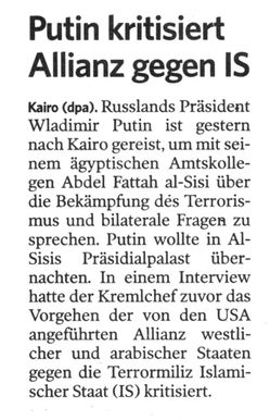 Die deutschen Medien stützen sich bei der Berichterstattung gern kostenbewußt auf die unter Schutz- gas abgepackten Fertiginformationen von dpa, AP oder AFP. Das Ergebnis ist dann öfters wie hier zu sehen, ein äußerst abgereichertes Sprachgebilde, dem man noch die Herkunft aus einer banalen Presse- mitteilung ansieht. Das Interview Putins zum Nahostkonflikt wird erwähnt. Nur, wo bleibt der Bericht über die Inhalte? Der folgt auch am nächsten Tag nicht. Man darf Leser und Zuschauer schließlich nicht mit Dingen verwirren, die sie halt nicht verstehen können. Tja, an dem Punkt schlägt dann Verschweigen in zweckvolle Desinformation um, meine sehr verehrte Lügenpresse. Denn was Putin hier (s.o.) zum x-ten Male zur Sprache bringt, ist kein Propagandagerede, es ist, in wenigen Sätzen zusammengefaßt, ein komplett anderes Paradigma des Konflikts in Syrien und Irak, logisch durchdacht und durch die Fakten gestützt: # Die Bombenangriffe der "Allianz" auf syrischem Gebiet ohne Genehmigung der legitimen Regierung stellen einen Bruch des Völkerrechts dar und sind überdies (ohne Operationen am Boden) völlig unzu- reichend, um die Milizen zu besiegen. (Wer den Verlauf des Vietnamkrieges noch im Kopf hat, muß Putin recht geben.) # Die Konflikte in Syrien und Irak sind durch Einmischung der Westmächte zu blutigen Bürgerkriegen entartet. (Ganz unstreitig hinsichtlich des amerikanisch geführten Angriffskrieges gegen den Irak und der Folgen; die plausibelste Erklärung für die syrische Variante des 'arabischen Frühlings'). # Die jetzige Bedrohung durch den IS in beiden Staaten ist ein Ergebnis dieser Interventionspolitik. (Nicht diskussionsbedürftig, weil Fakt.) # Das amerikanische Festhalten an der Politik der "doppelten Standards", mit der Regierung des Irak zusammenzuarbeiten, mit Assad jedoch nicht, sabotiert eine pragmatische Lösungs des Problems 'IS'. # Der entscheidende Punkt in Putins Konzept wird im Interview mehr beiläufig angesprochen: die Auf- forderung, in Zusammenarbeit mit dem Baath-Regime und seinen Bodentruppen dem grausi- gen syrischen Totentanz ein Ende zu machen. Und natürlich steht im Hintergrund immer die russi- sche Forderung, das neokolonialistische, Projekt eines regime change in Syrien endlich aufzugeben und Frieden mit Assad zu machen. Heute wie auch schon vor drei Jahren wird die internationale veröffentlichte Meinung dominiert von denen, welche die Verantwortung für den Tod, die Verstümmelung hunderttausender Menschen, die Vernichtung der Existenz von Millionen einfach dem Regime Baschar al-Assads zuweisen: Wäre er zurückgetreten, hätte das alles nicht geschehen müssen. Was für eine obszön dumme Logik. Eine Regierung, die ihre Verantwortung für den Staat hinwirft, sobald eine Minderheit von Verückten nicht etwa Neuwahlen, son- dern bescheiden die "demokratische" Aushändigung der Macht fordert, gehört vors Standgericht. Heißt es nicht so schön: "A man must do what a man has got to do" oder so ähnlich? Man kann sich heute durchaus auf den Standpunkt stellen, daß das harte, ja brutale Durchgreifen der syrischen Staatsorgane gegen den beginnenden Veitstanz des 'arabischen Frühlings' den Ausbruch des Bürgerkrieges befördert hat. Oder war das Durchgreifen nur nicht konsequent genug, um dem verantwor- tungslosen Treiben einiger hundert politischer Amokfahrer ein Ende zu bereiten? Ich neige zur letzteren Auffassung. Unnötig hart oder nicht hart genug? Festzustellen ist in jedem Fall und zahlreiche Staats- und Völkerrechtler in aller Welt tun das , daß die einigen Dutzend, vielleicht hundert Todesopfer dieser ersten Konfrontationen die Herbeiführung eines Bürgerkrieges durch die 'Opposition' in keinster Weise rechtfertigen können. Denn sie sind schlicht Peanuts, gemessen an dem daraus folgenden Blutbad, für dessen Herbeiführung sie die Rechtfertigung abgeben sollen. Spätestens Mitte 2012 war es klar, daß trotz massiver Unterstützung durch die "Freunde Syriens" der Aufstand kein einfacher Marsch auf Damaskus geworden war, auch nicht werden würde. Aber weder die zynischen Strippenzieher in Washington und Europa noch ihre intriganten arabischen Spießgesellen noch die bewußtlosen Massen der westlichen Medienzivilisation erkannten eine Notwendigkeit, hier die Notbremse zu ziehen. Zum Auftreten von al Daula al Islamija Ergebnis einer so nicht vorhersehbaren, pathologischen Eigendynamik innerhalb der islamistischen Gruppierungen hätte es in diesem Ausmaß gar nicht kommen können, die zahllosen IS-Massaker an der nicht-sunnitischen Bevölkerung wären ver- mieden worden, hätte der Westen den sinnlosen Kämpfen früher ein Ende gemacht, bei einem Zähler stand von 'nur' etwa 200.000 Toten. Das erforderte kein völkerrechtswidriges aktives Eingreifen in die Kämpfe, sondern die Unterbindung der enormen Geld- und Waffenströme aus Saudiarabien, Qatar, der Türkei usw. Ohne diese wären sowohl dem IS als auch der 'gemäßigten' Opposition binnen Wochen die Mittel für größere Operationen ausgegangen. Woraus im Umkehrschluß folgt, daß diese üppigen Nach- schublieferungen bis heute andauern. Die Frage, wieso es nicht möglich sein soll, die Verteilungskanäle für das Erdöl (die andere munter sprudelnde Einnahmequelle des Killerkalifats) 'chirurgisch' zu durch- trennen, hat nicht nur für Verschwörungstheoretiker einen gewissen Charme. Bei Lichte besehen ist das Auftauchen des IS für einige Beteiligte ganz praktisch, weil es die Aufmerk- samkeit der Welt von der Frage nach der schlimmen Schuld des Westens ablenkt, der an einer Beendi- gung des Blutvergießens gar nicht interessiert war und ist. Genau dieses Moment der Ablenkung böte bei pragmatischer Betrachtung den Amerikanern, wenn sie es denn überhaupt wollten, eine gute Gele- genheit, sich ohne allzu großen Gesichtsverlust aus der sinnlosen und letztlich verbrecherischen Ver- schwörung gegen die legale und, cum grano salis, auch legitime Regierung Syriens zurückzuziehen. 